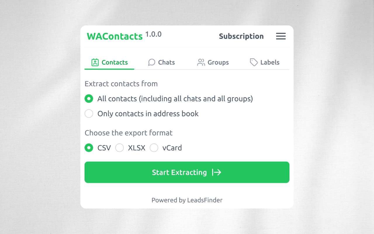 WAContacts is a powerful contact saver that allows you to extract contacts from WhatsApp chats, groups, or labels with just one click. It helps you save time and effort in contact extraction by providing valuable data such as contact name, phone number, and more.What formats does WAContacts export?